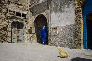 🇲🇦 This photograph was taken in Essaouira. The striking blue robe of the woman passing by the arch draws the eye, creating a vibrant contrast against the aged, weathered stone. The presence of the cat watching the woman in the foreground adds a dynamic element, inviting the viewer to explore the scene further. A charming moment of everyday life in Essaouira's old town.
